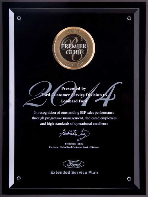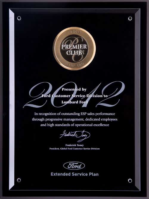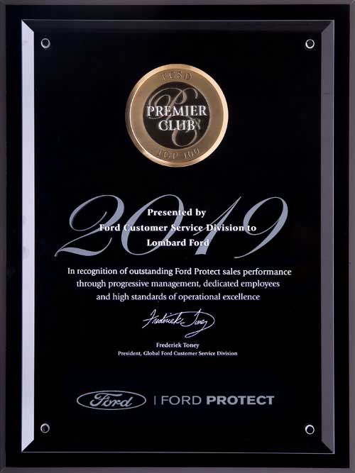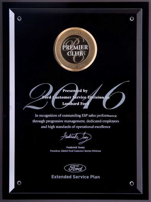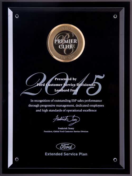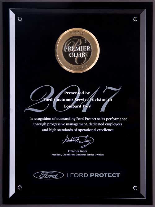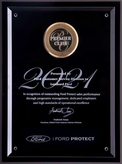 The Ford President's Award. This makes 6 times in 10 years that Lombard Ford has received this highest honor bestowed by Ford. Only the Top Ten Percent of Ford dealers in the country receive this exclusive honor based upon their performance in Customer Service and Sales achievements as reported by their customers. No other dealership in our area has attained this level of consistent Customer Satisfaction.