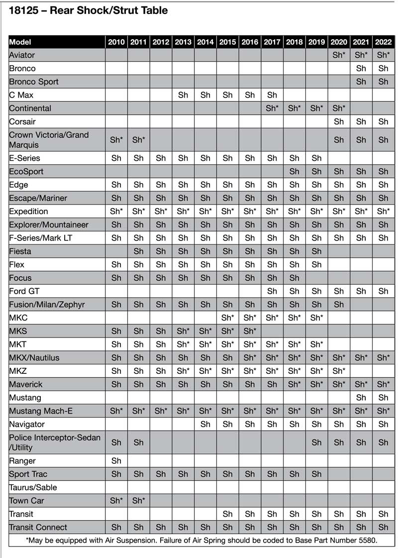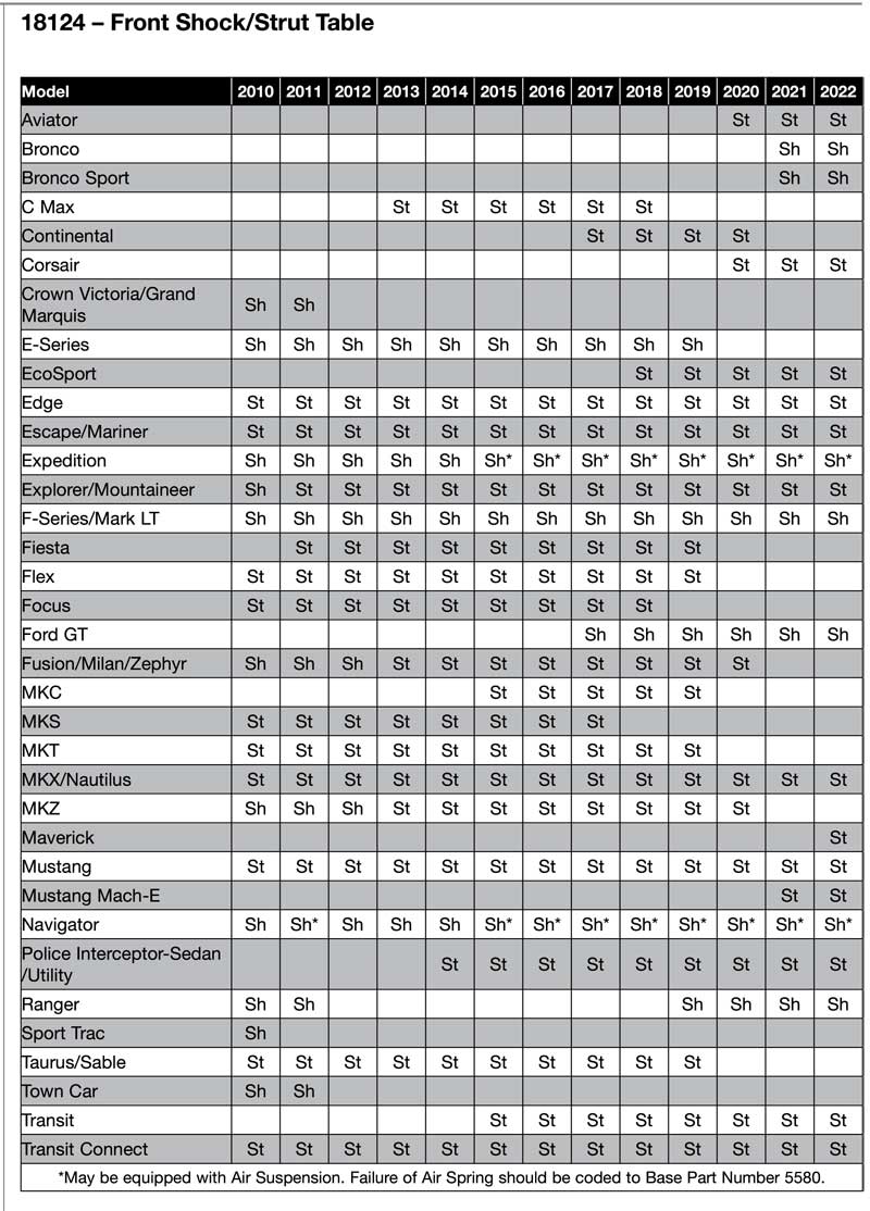Here are two helpful charts to indentify whether your Ford or Lincoln model is equipped with struts or shock absorbers for both the front and rear suspension systems.
